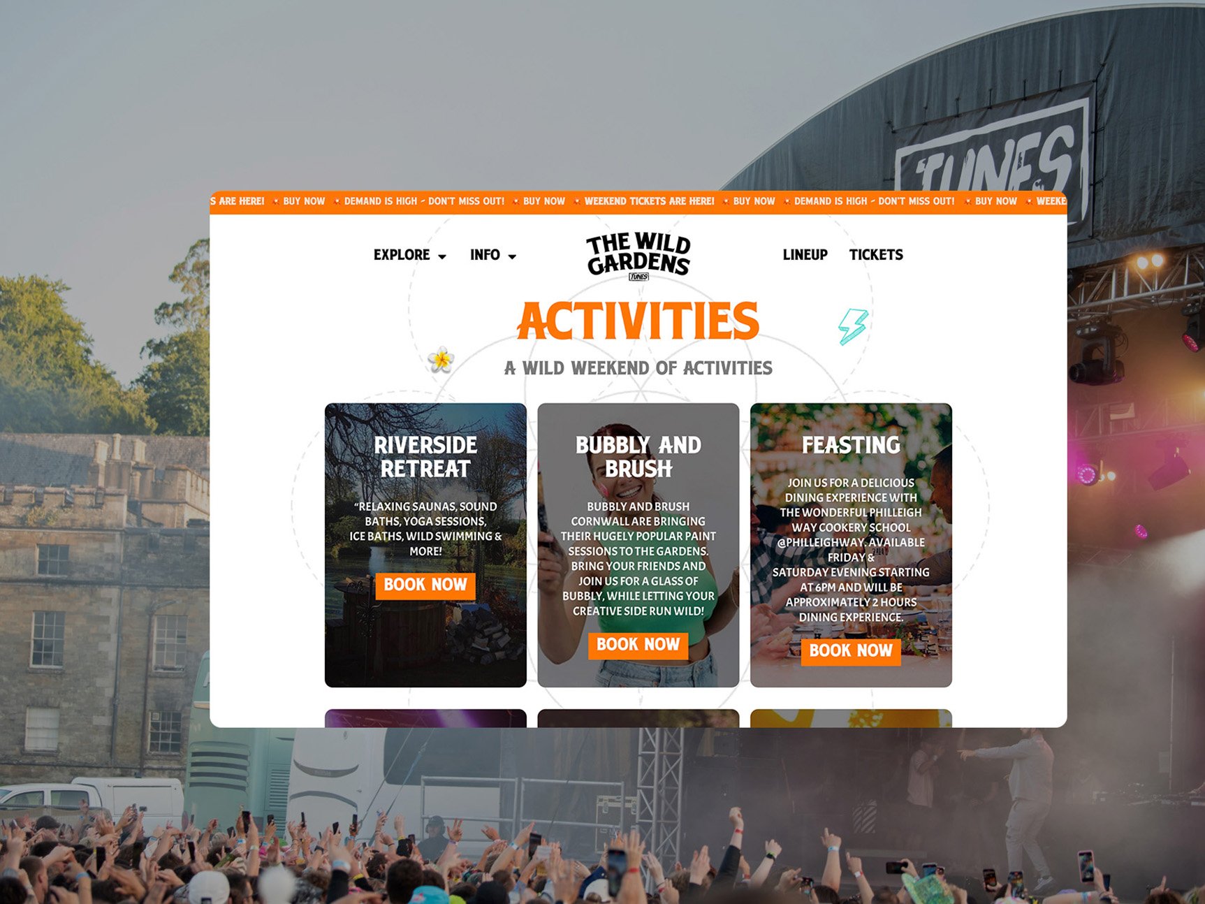 We designed a highly bespoke and immersive website that mirrors the enchanting atmosphere of The Wild Gardens. Using fluid animations, interactive elements, and nature-inspired aesthetics, we created a digital experience that feels as dynamic and exciting as the festival itself. The site’s intuitive navigation seamlessly guides visitors through artist lineups, event schedules, and storytelling elements. Each annual refresh enhances the design with new animations, visuals, and features, ensuring the website remains a living, breathing extension of The Wild Gardens festival.